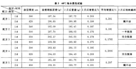 試驗(yàn)過(guò)程:將不同填料的配方做出的粉末涂料樣品,涂塑在鋼板(3mm厚)上,每個(gè)配方涂塑兩個(gè)樣件,涂塑工藝都是200℃預(yù)熱30min,180℃固化30min。每種涂料做兩塊樣板,分別定為1#、2#。然后將涂塑好的樣件浸泡于60℃的海水中(海水取自上海奉賢海邊),浸泡時(shí)間為三個(gè)月。浸泡試驗(yàn)結(jié)果列于表3中。